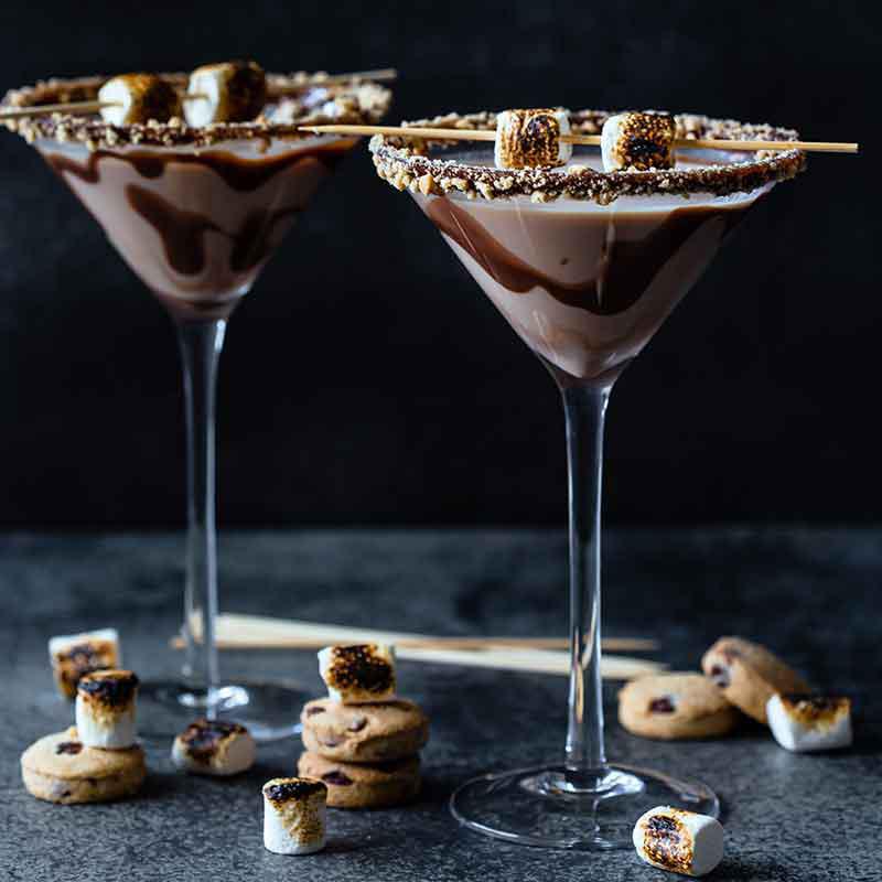 Shake vigrously over ice & Garnish with grated Chocolate & skewered Toasted Marshmellow